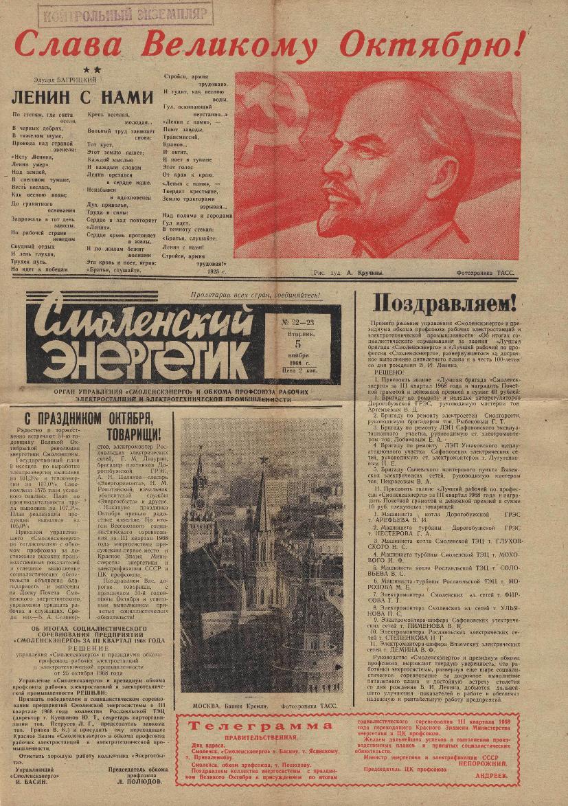 Смоленский энергетик: Орган управления "Смоленскэнерго" и обкома Союза работников электростанции и электротехнической промышленности. — Смоленск: Смолгортип., 1968-____. № 22-23.