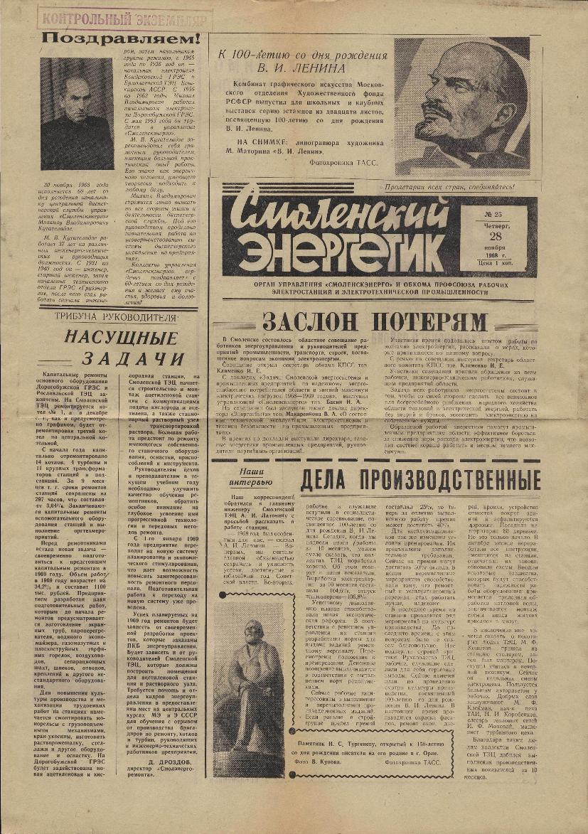 Смоленский энергетик: Орган управления "Смоленскэнерго" и обкома Союза работников электростанции и электротехнической промышленности. — Смоленск: Смолгортип., 1968-____. № 25.