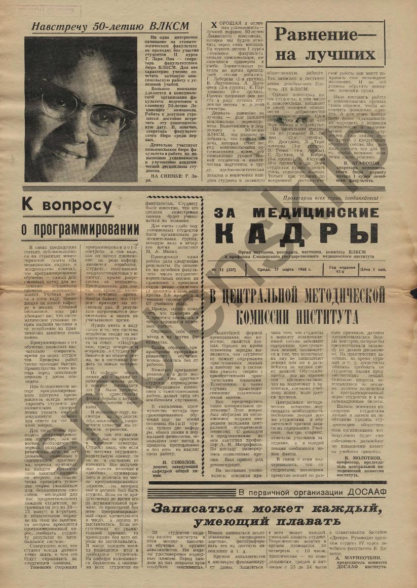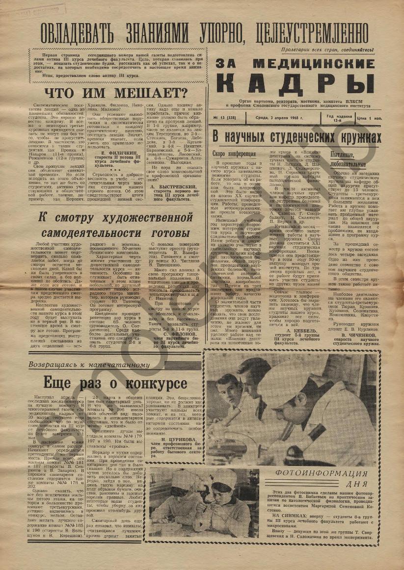 За медицинские кадры: Орган парткома, ректората, месткома, комитета ВЛКСМ и профкома Смоленского государственного медицинского института. — Смоленск: Тип. им. Смирнова, 1957-____. № 13.