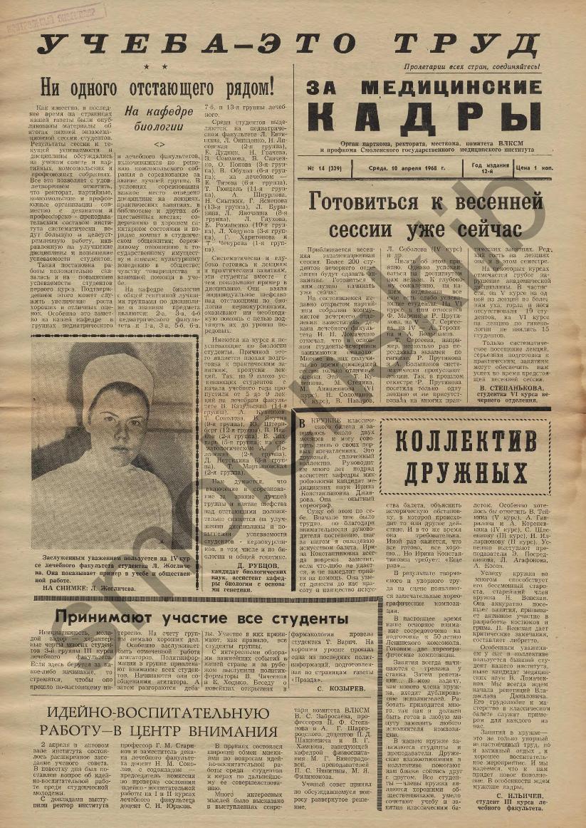 За медицинские кадры: Орган парткома, ректората, месткома, комитета ВЛКСМ и профкома Смоленского государственного медицинского института. — Смоленск: Тип. им. Смирнова, 1957-____. № 14.