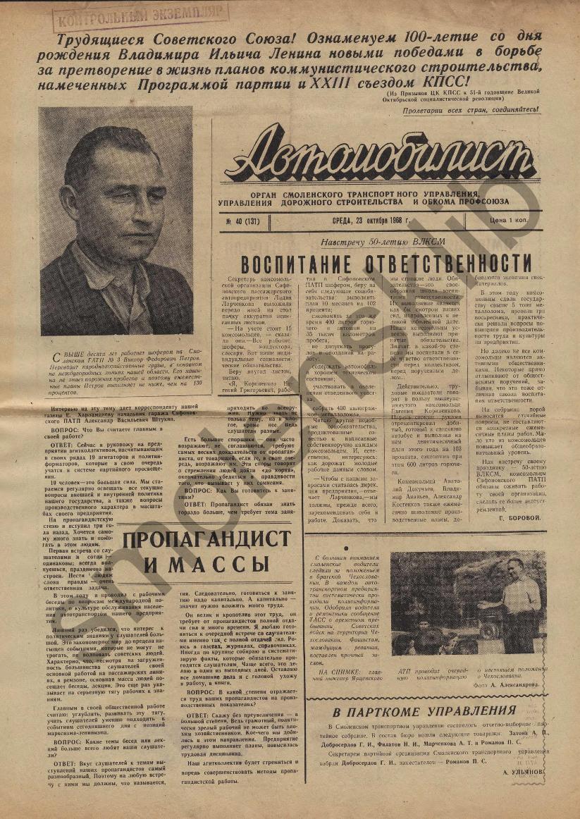 Автомобилист: Орган Смоленского транспортного управления, управления дорожного строительства и Обкома профсоюза. — Смоленск: Смолгортип., 1966-____. № 40.