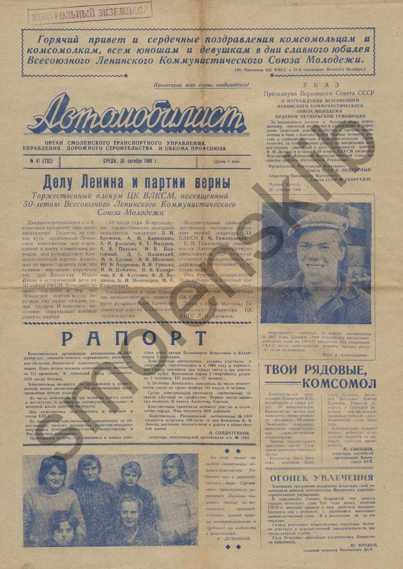 Автомобилист: Орган Смоленского транспортного управления, управления дорожного строительства и Обкома профсоюза. — Смоленск: Смолгортип., 1966-____. № 41.