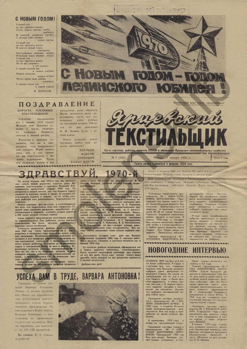 Ярцевский текстильщик: Орган парткома, фабкома, комитета ВЛКСМ и управления Ярцевского хлопчатобумажного комбината. — Ярцево: Ярцевская тип., 1965-____. № 1.