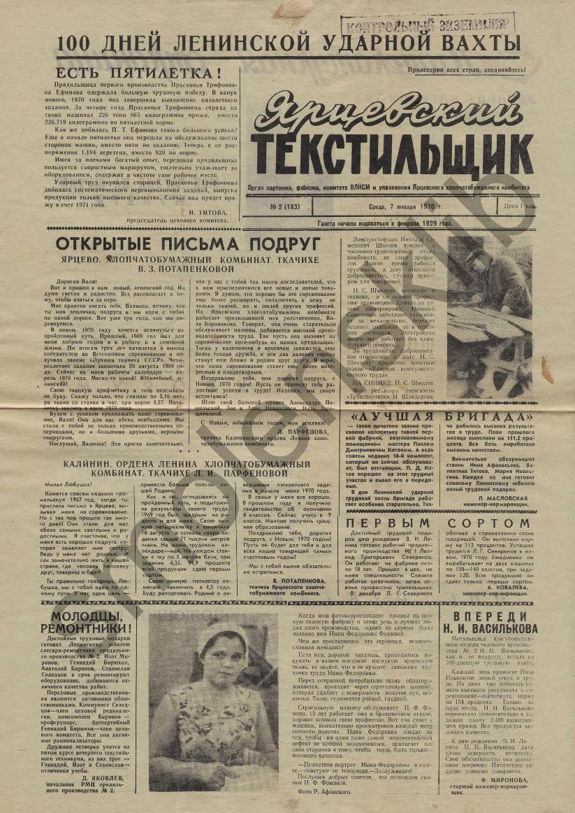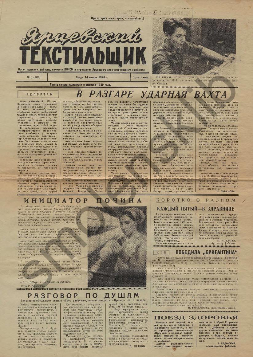 Ярцевский текстильщик: Орган парткома, фабкома, комитета ВЛКСМ и управления Ярцевского хлопчатобумажного комбината. — Ярцево: Ярцевская тип., 1965-____. № 2.