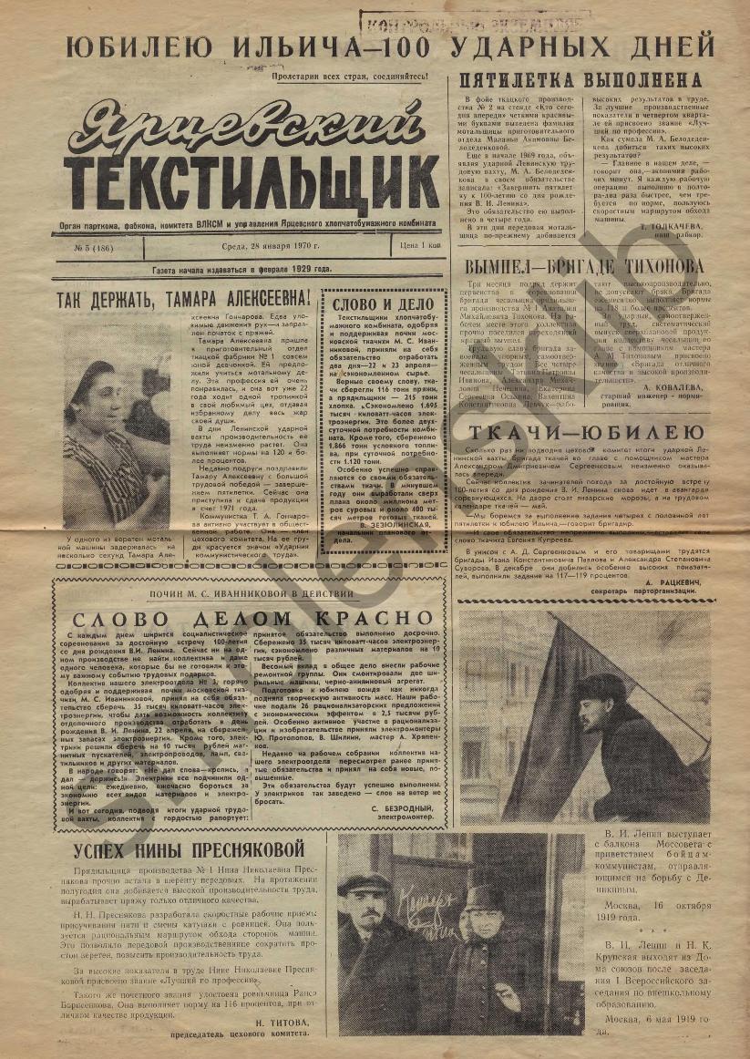 Ярцевский текстильщик: Орган парткома, фабкома, комитета ВЛКСМ и управления Ярцевского хлопчатобумажного комбината. — Ярцево: Ярцевская тип., 1965-____. № 5.