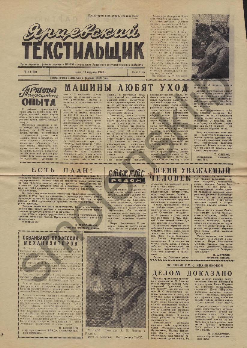 Ярцевский текстильщик: Орган парткома, фабкома, комитета ВЛКСМ и управления Ярцевского хлопчатобумажного комбината. — Ярцево: Ярцевская тип., 1965-____. № 7.