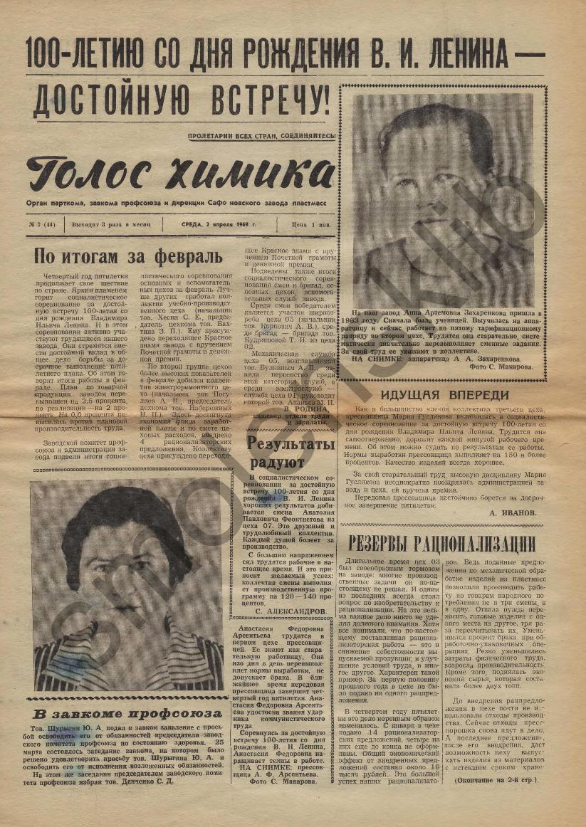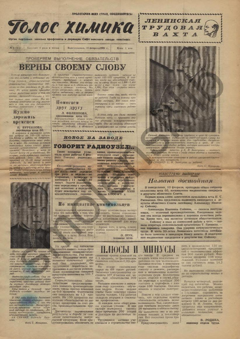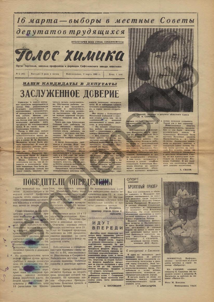 Голос химика: Орган парткома, завкома профсоюза и дирекции Сафоновского завода пластмасс. — Сафоново: Сафонов. тип. Смолоблуправ., 1966-____. № 13.