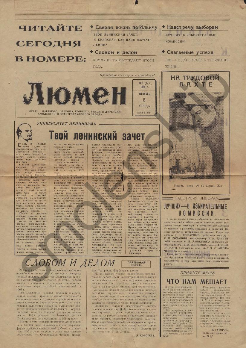 Люмен: Орган партбюро, завкома, комитета ВЛКСМ и дирекции Смоленского электролампового завода. — Смоленск: Смолгортип., 1968-____. № 5.