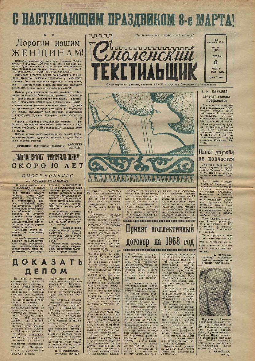 Смоленский текстильщик: Орган парткома, фабкома, комитета ВЛКСМ и дирекции Смоленского льнокомбината. — Смоленск: Тип. им. Смирнова, 1957-____. № 10.