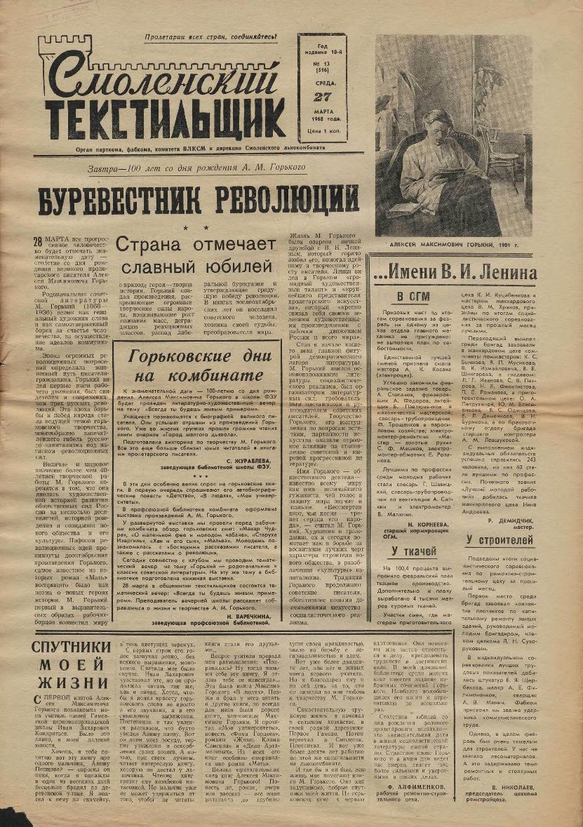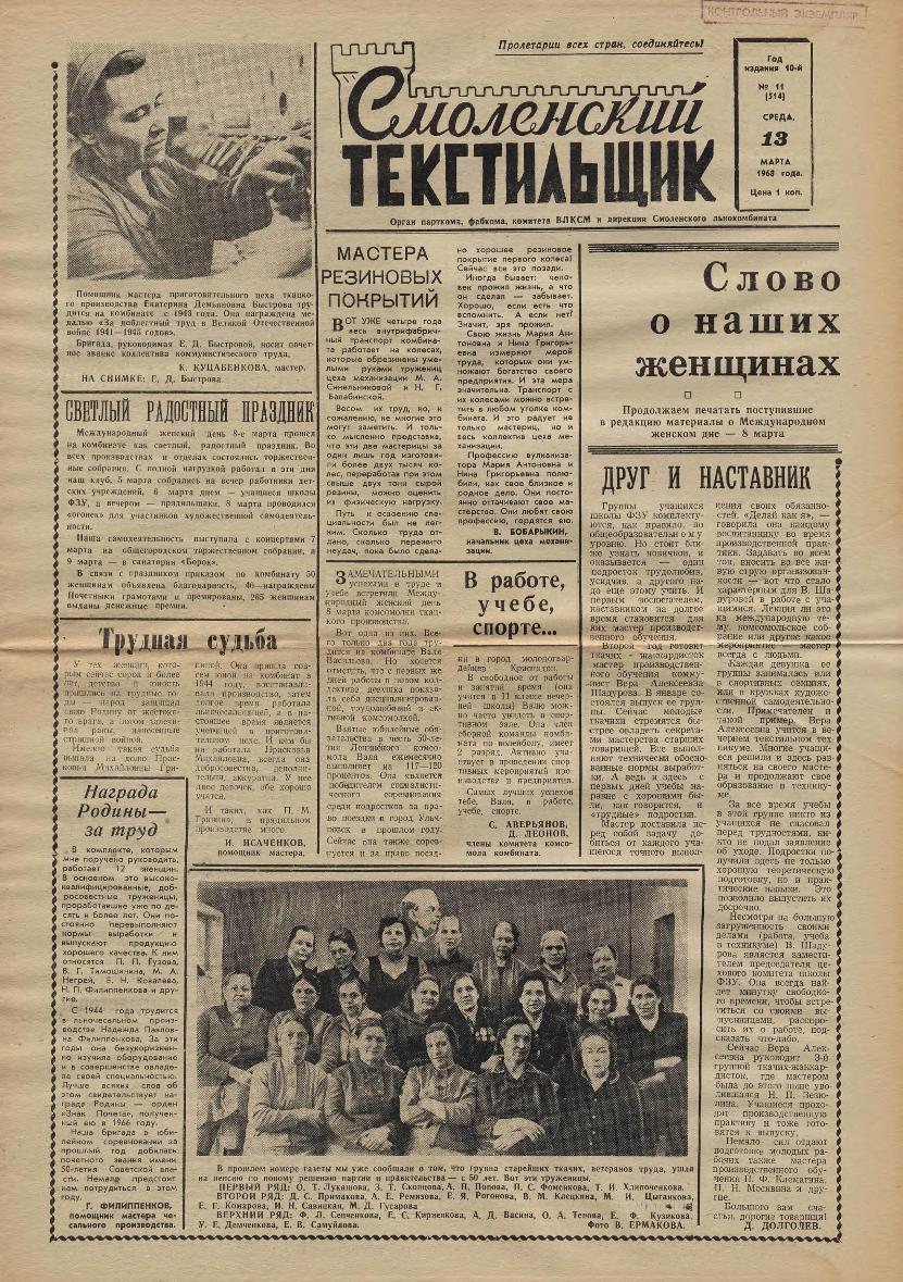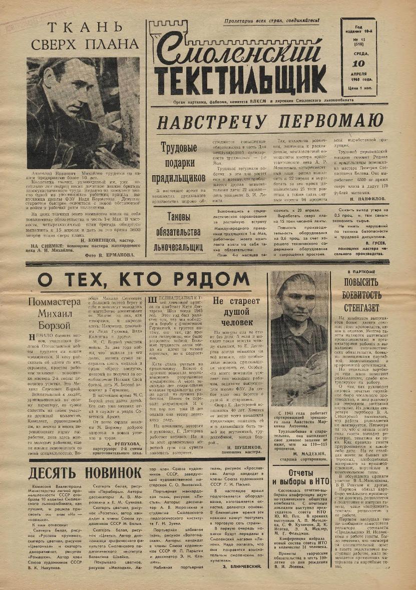 Смоленский текстильщик: Орган парткома, фабкома, комитета ВЛКСМ и дирекции Смоленского льнокомбината. — Смоленск: Тип. им. Смирнова, 1957-____. № 13.
