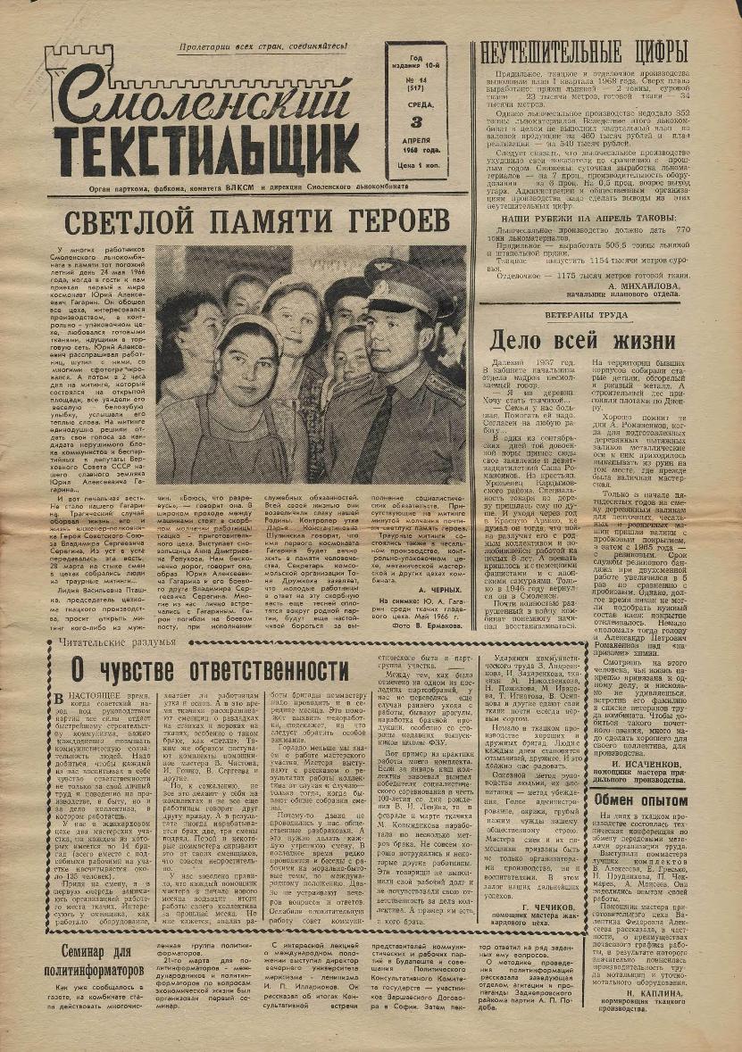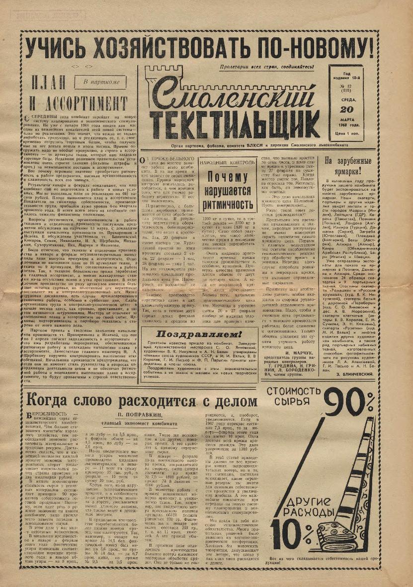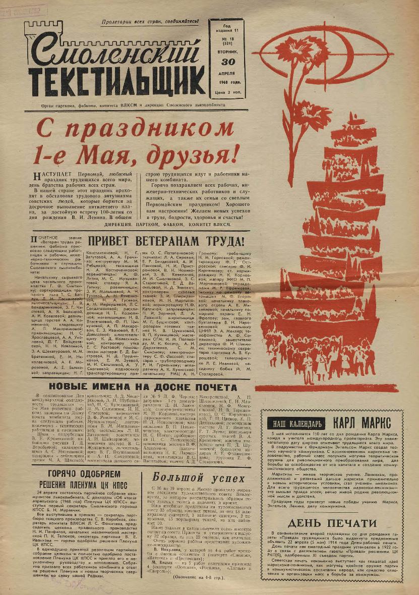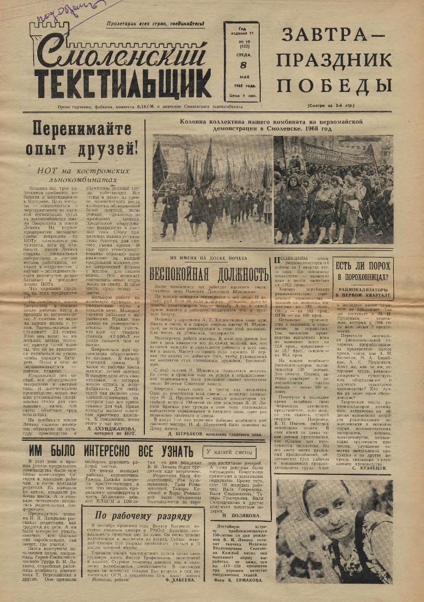 Смоленский текстильщик: Орган парткома, фабкома, комитета ВЛКСМ и дирекции Смоленского льнокомбината. — Смоленск: Тип. им. Смирнова, 1957-____. № 19.