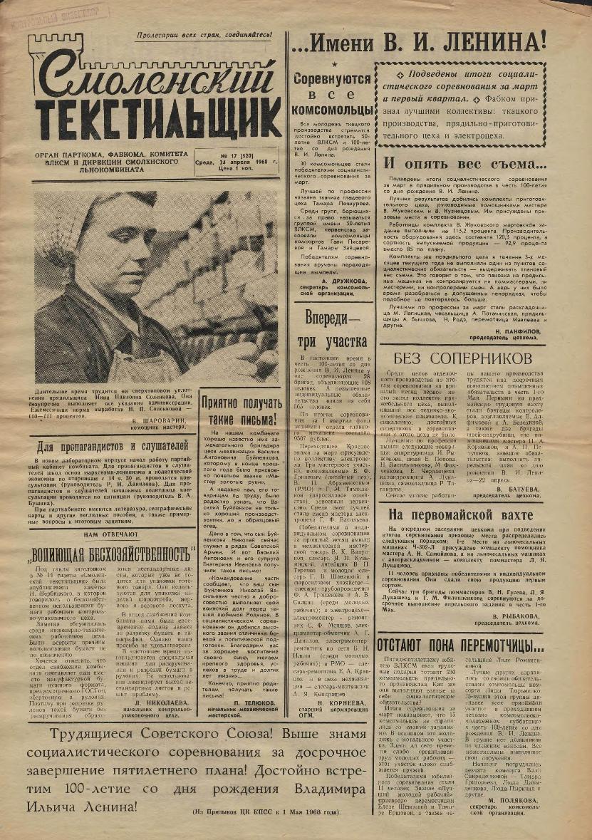 Смоленский текстильщик: Орган парткома, фабкома, комитета ВЛКСМ и дирекции Смоленского льнокомбината. — Смоленск: Тип. им. Смирнова, 1957-____. № 17.
