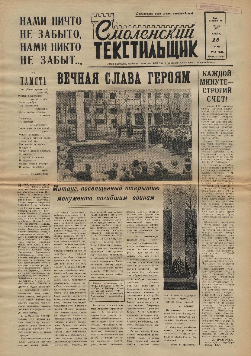 Смоленский текстильщик: Орган парткома, фабкома, комитета ВЛКСМ и дирекции Смоленского льнокомбината. — Смоленск: Тип. им. Смирнова, 1957-____. № 20.