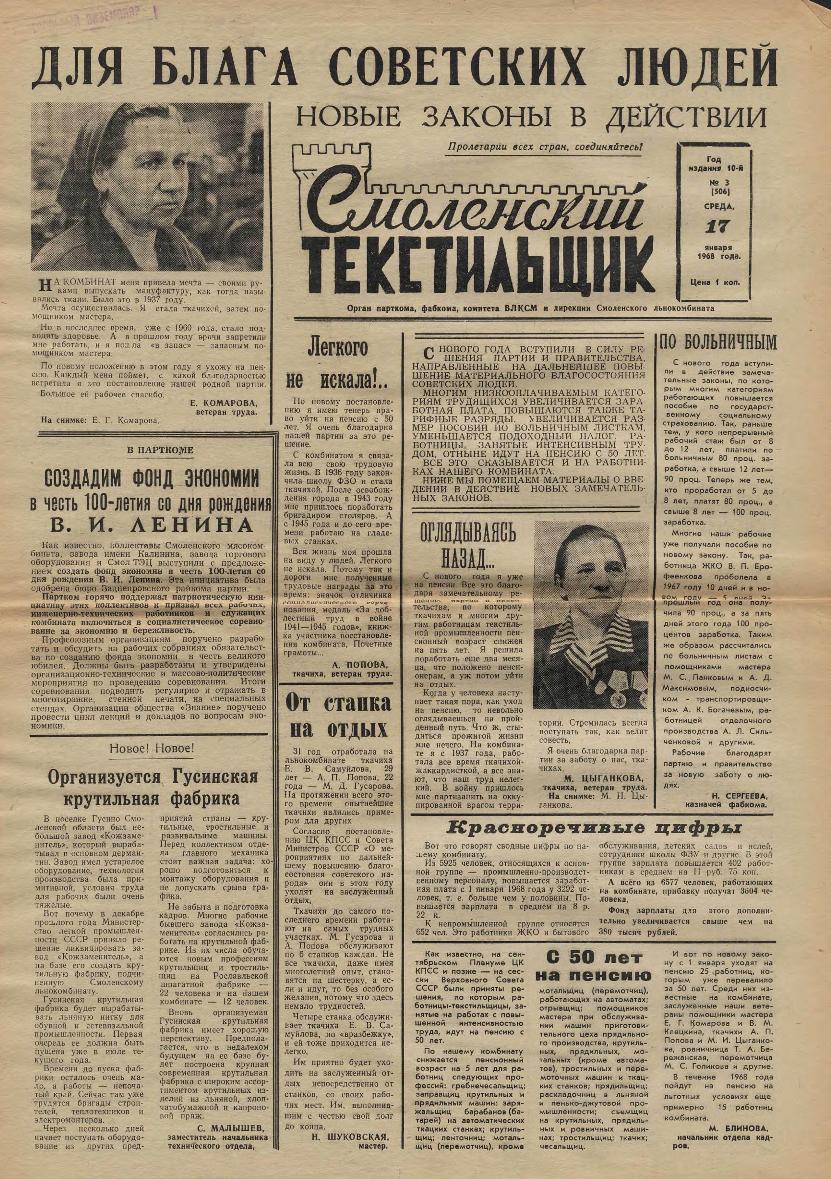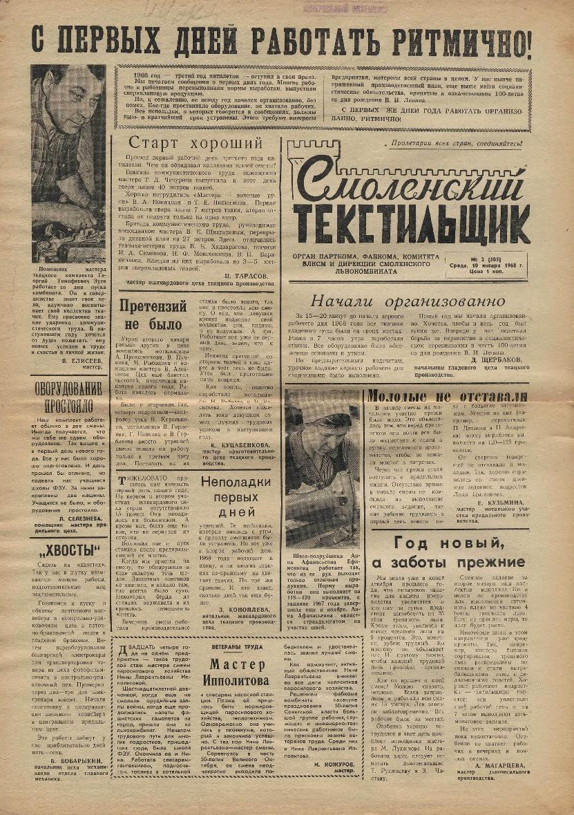 Смоленский текстильщик: Орган парткома, фабкома, комитета ВЛКСМ и дирекции Смоленского льнокомбината. — Смоленск: Тип. им. Смирнова, 1957-____. № 3.