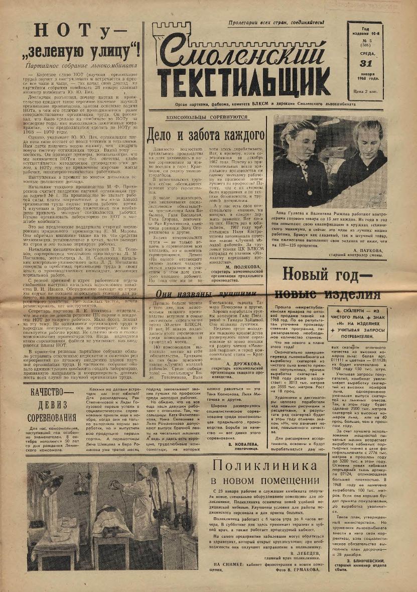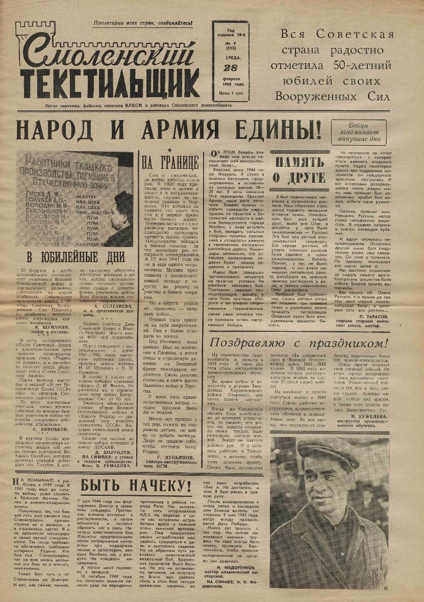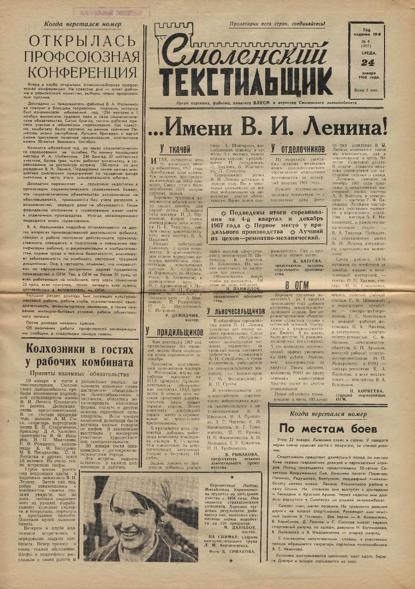 Смоленский текстильщик: Орган парткома, фабкома, комитета ВЛКСМ и дирекции Смоленского льнокомбината. — Смоленск: Тип. им. Смирнова, 1957-____. № 2.
