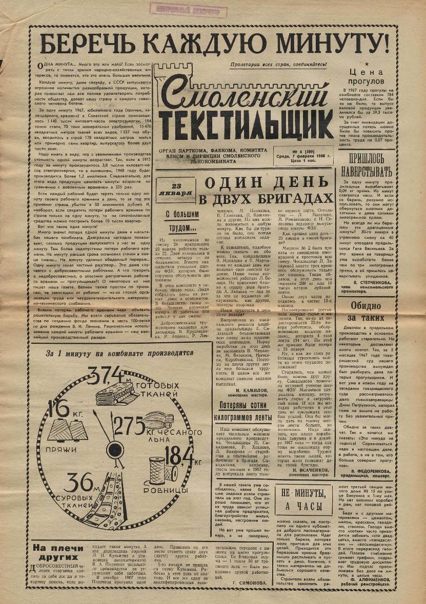 Смоленский текстильщик: Орган парткома, фабкома, комитета ВЛКСМ и дирекции Смоленского льнокомбината. — Смоленск: Тип. им. Смирнова, 1957-____. № 6.