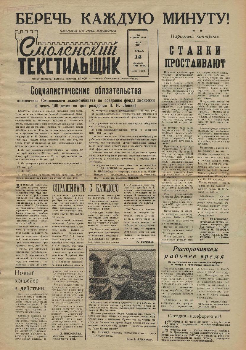 Смоленский текстильщик: Орган парткома, фабкома, комитета ВЛКСМ и дирекции Смоленского льнокомбината. — Смоленск: Тип. им. Смирнова, 1957-____. № 7.