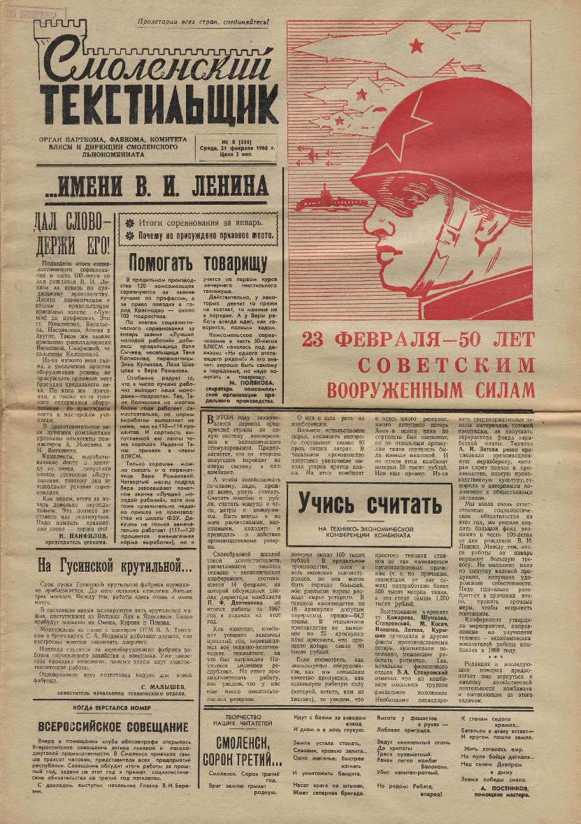 Смоленский текстильщик: Орган парткома, фабкома, комитета ВЛКСМ и дирекции Смоленского льнокомбината. — Смоленск: Тип. им. Смирнова, 1957-____. № 8.
