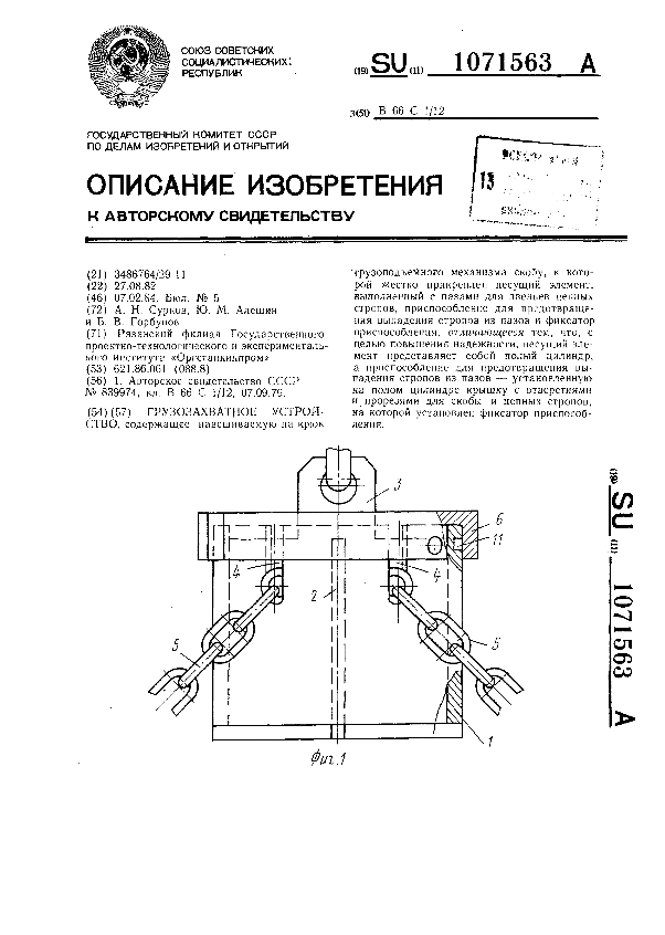Грузозахватное устройство / Сурков А. Н., Алешин Ю, М., Горбунов Б. В.; заявитель: Рязанский филиал Государственного проектно-технологического и экспериментального института «Оргстанкинпром» // Описания изобретений (ретрофонд) / Комитет по патентам и товарным знакам России. – М. — (Патенты России)., 2003. – 1984, № 1. — Загл. с титул. экрана. — Поисковая система: ИПС MIMOSA GTI. — Систем. требования: Acrobat Reader. — Режим доступа: ftp://smolensklib.ru/bd/patent_ru/pt1071563.pdf. — <URL:ftp://smolensklib.ru/bd/patent_ru/pt1071563.pdf>.