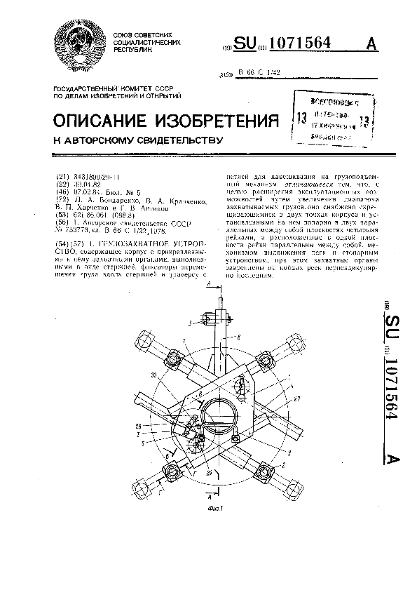 Грузозахватное устройство / Бондаренко Л. А., Кравченко В. А., Харченко В. П., Антипов Г. В. // Описания изобретений (ретрофонд) / Комитет по патентам и товарным знакам России. – М. — (Патенты России)., 2003. – 1984, № 1. — Загл. с титул. экрана. — Поисковая система: ИПС MIMOSA GTI. — Систем. требования: Acrobat Reader. — Режим доступа: ftp://smolensklib.ru/bd/patent_ru/pt1071564.pdf. — <URL:ftp://smolensklib.ru/bd/patent_ru/pt1071564.pdf>.
