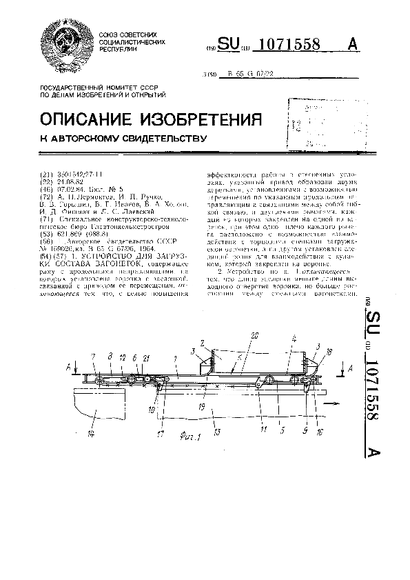 Устройство для загрузки состава вагонеток / Лермонтов А. П. , Ручко И, П., Горышин В. В. [и др.]; заявитель: Специальное конструкторско-технологическое бюро Главтоннельметростроя // Описания изобретений (ретрофонд) / Комитет по патентам и товарным знакам России. – М. — (Патенты России)., 2003. – 1984, № 1. — Загл. с титул. экрана. — Поисковая система: ИПС MIMOSA GTI. — Систем. требования: Acrobat Reader. — Режим доступа: ftp://smolensklib.ru/bd/patent_ru/pt1071558.pdf. — <URL:ftp://smolensklib.ru/bd/patent_ru/pt1071558.pdf>.