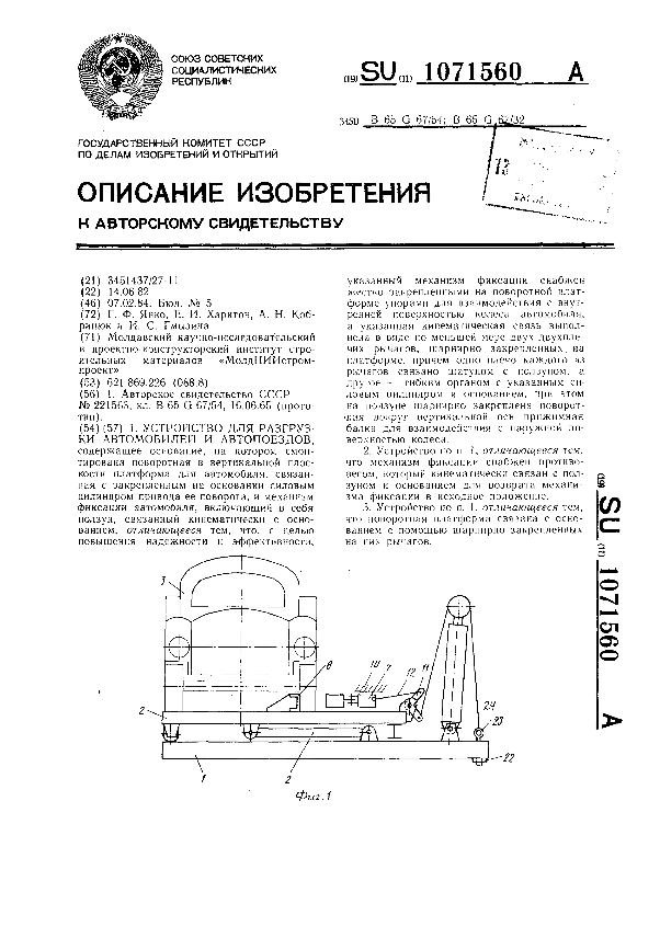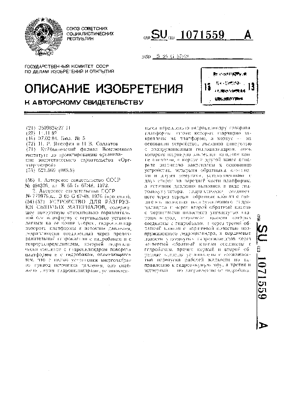 Устройство для разгрузки разгрузки автомобилей и автопоездов / Янко Г. Ф., Харитон Е. И., Кобринюк А. Н., Гмызина И. С.; заявитель: Молдавский научно-исследовательский и проектно-конструкторский институт строительных материалов "МолдНИИстромпроект" // Описания изобретений (ретрофонд) / Комитет по патентам и товарным знакам России. – М. — (Патенты России)., 2003. – 1984, № 1. — Загл. с титул. экрана. — Поисковая система: ИПС MIMOSA GTI. — Систем. требования: Acrobat Reader. — Режим доступа: ftp://smolensklib.ru/bd/patent_ru/pt1071560.pdf. — <URL:ftp://smolensklib.ru/bd/patent_ru/pt1071560.pdf>.