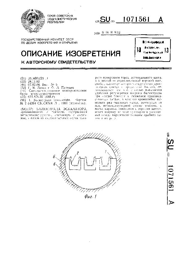 Балюстрада эскалатора / Леках Г. Я., Пальцев Ф. Л.; заявитель: Специализированное конструкторское бюро эскалаторостроения // Описания изобретений (ретрофонд) / Комитет по патентам и товарным знакам России. – М. — (Патенты России)., 2003. – 1984, № 1. — Загл. с титул. экрана. — Поисковая система: ИПС MIMOSA GTI. — Систем. требования: Acrobat Reader. — Режим доступа: ftp://smolensklib.ru/bd/patent_ru/pt1071561.pdf. — <URL:ftp://smolensklib.ru/bd/patent_ru/pt1071561.pdf>.