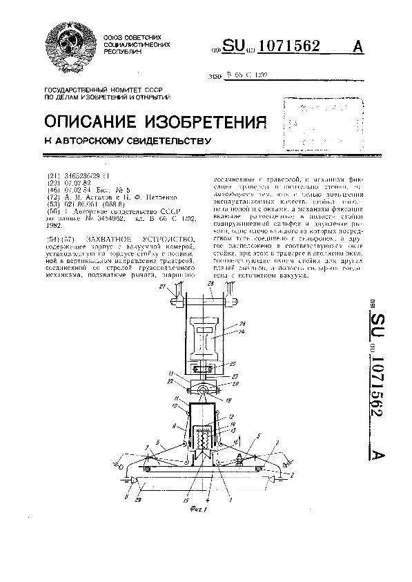 Захватное устройство / Астахов А. Я., Петренко Н. Ф. // Описания изобретений (ретрофонд) / Комитет по патентам и товарным знакам России. – М. — (Патенты России)., 2003. – 1984, № 1. — Загл. с титул. экрана. — Поисковая система: ИПС MIMOSA GTI. — Систем. требования: Acrobat Reader. — Режим доступа: ftp://smolensklib.ru/bd/patent_ru/pt1071562.pdf. — <URL:ftp://smolensklib.ru/bd/patent_ru/pt1071562.pdf>.