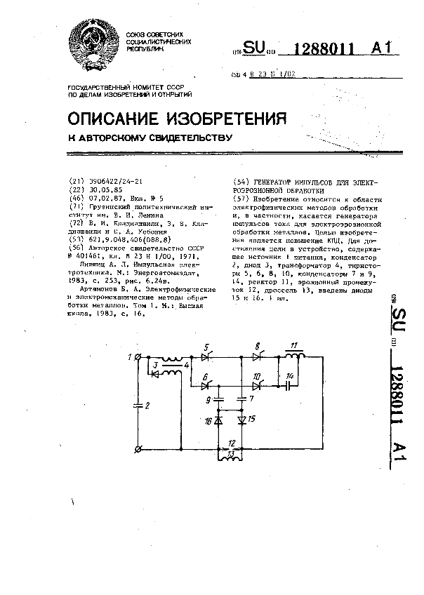 Генератор импульсов для электроэрозионной обработки / Кладиашвили В. И., Кладиашвили З. В., Мебония С. А.; заявитель: Грузинский политехнический институт им. В. И. Ленина // Описания изобретений (ретрофонд) / Комитет по патентам и товарным знакам России. – М., 2003. – 1987, № 1. — (Патенты России). — Загл. с титул. экрана. — Поисковая система: MIMOSA GTI. — Систем. требования: Acrobat Reader. — Режим доступа: ftp://smolensklib.ru/bd/patent_ru/pt1288011.pdf. — <URL:ftp://smolensklib.ru/bd/patent_ru/pt1288011.pdf>.