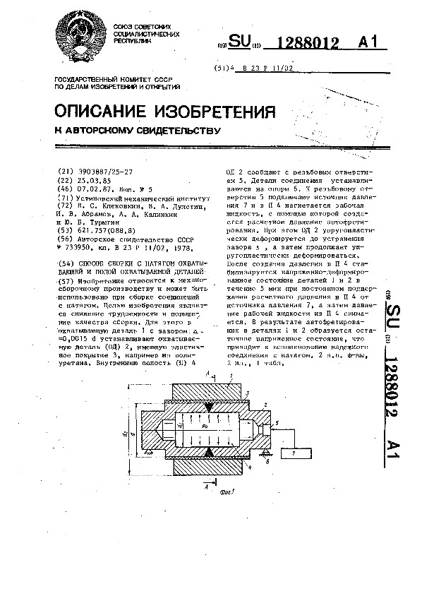 Способ сборки с натягом охватывающей и полой охватываемой деталей / Клековкин В. С., Дулотин В. А., Абрамов И. В. [и др.]; заявитель: Устиновский механический институт // Описания изобретений (ретрофонд) / Комитет по патентам и товарным знакам России. – М., 2003. – 1987, № 1. — (Патенты России). — Загл. с титул. экрана. — Поисковая система: MIMOSA GTI. — Систем. требования: Acrobat Reader. — Режим доступа: ftp://smolensklib.ru/bd/patent_ru/pt1288012.pdf. — <URL:ftp://smolensklib.ru/bd/patent_ru/pt1288012.pdf>.