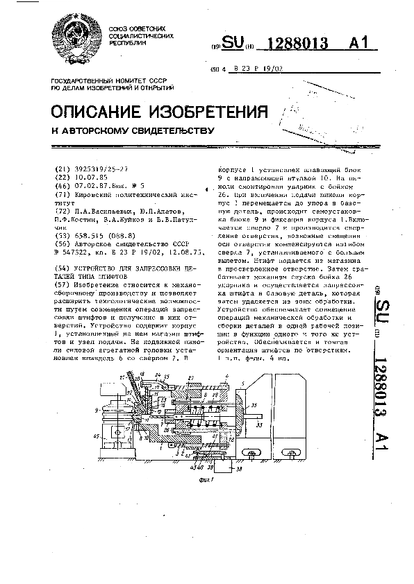 Устройство для запрессовки деталей типа штифтов / Васильевых Л. А., Апатов Ю. Л., Костин П. Ф. [и др.]; заявитель: Кировский политехнический институт // Описания изобретений (ретрофонд) / Комитет по патентам и товарным знакам России. – М., 2003. – 1987, № 1. — (Патенты России). — Загл. с титул. экрана. — Поисковая система: MIMOSA GTI. — Систем. требования: Acrobat Reader. — Режим доступа: ftp://smolensklib.ru/bd/patent_ru/pt1288013.pdf. — <URL:ftp://smolensklib.ru/bd/patent_ru/pt1288013.pdf>.