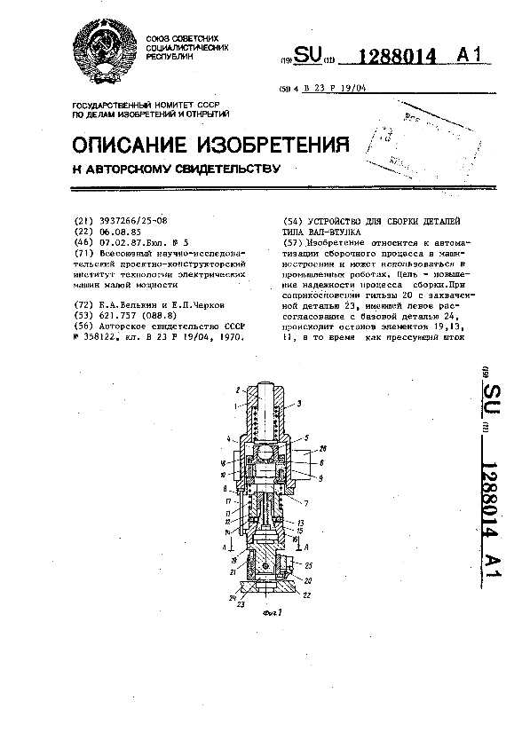 Устройство для сборки деталей типа вал-втулка / Велькин Е. А., Черков Е. П.; заявитель: Всесоюзный научно-исследовательский проектно-конструкторский институт технологии электрических машин малой мощности // Описания изобретений (ретрофонд) / Комитет по патентам и товарным знакам России. – М., 2003. – 1987, № 1. — (Патенты России). — Загл. с титул. экрана. — Поисковая система: MIMOSA GTI. — Систем. требования: Acrobat Reader. — Режим доступа: ftp://smolensklib.ru/bd/patent_ru/pt1288014.pdf. — <URL:ftp://smolensklib.ru/bd/patent_ru/pt1288014.pdf>.