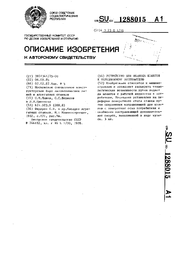 Устройство для подвода шлангов к передвижному потребителю / Пыжов С. Н., Борисов С. П., Цветкова Л. В.; заявитель: Московское специальное конструкторское бюро автоматических линий и агрегатных станков // Описания изобретений (ретрофонд) / Комитет по патентам и товарным знакам России. – М., 2003. – 1987, № 1. — (Патенты России). — Загл. с титул. экрана. — Поисковая система: MIMOSA GTI. — Систем. требования: Acrobat Reader. — Режим доступа: ftp://smolensklib.ru/bd/patent_ru/pt1288015.pdf. — <URL:ftp://smolensklib.ru/bd/patent_ru/pt1288015.pdf>.