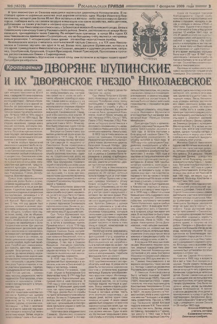 Иванцов, А. Дворяне Шупинские и их «дворянское гнездо Николаевское» // Рославльская правда: общественно-политическая газета Рославльского района / Аппарат Администрации Смоленской обл., администрация МО "Рославльский район", редакция газеты; ред. А. М. Элькинд. – г. Рославль (Смоленская область), 2009. – 7 февраля — <URL:http://elib.smolensklib.ru/bd/tenish/000005891.pdf>.