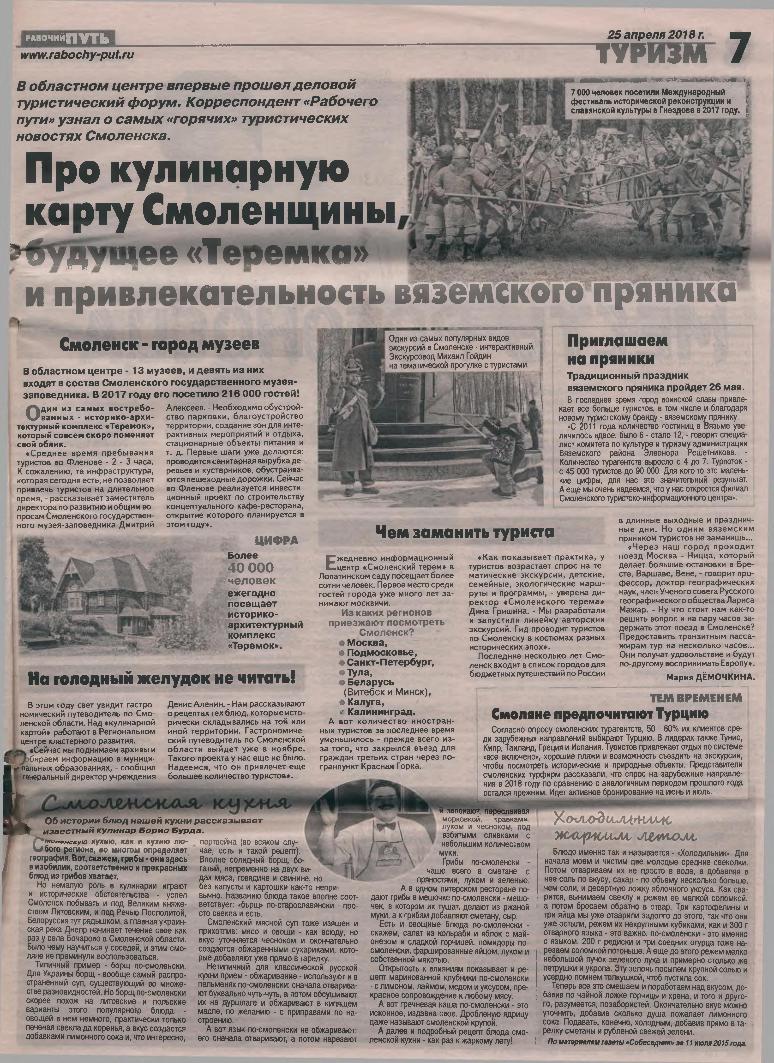 Демочкина, М. Про кулинарную карту Смоленщины, будущее «Теремка» и привлекательность вяземского пряника / М. Демочкина // Рабочий путь, 2018. – 25 апреля — <URL:ftp://smolensklib.ru/bd/tenish/000005892.pdf>.
