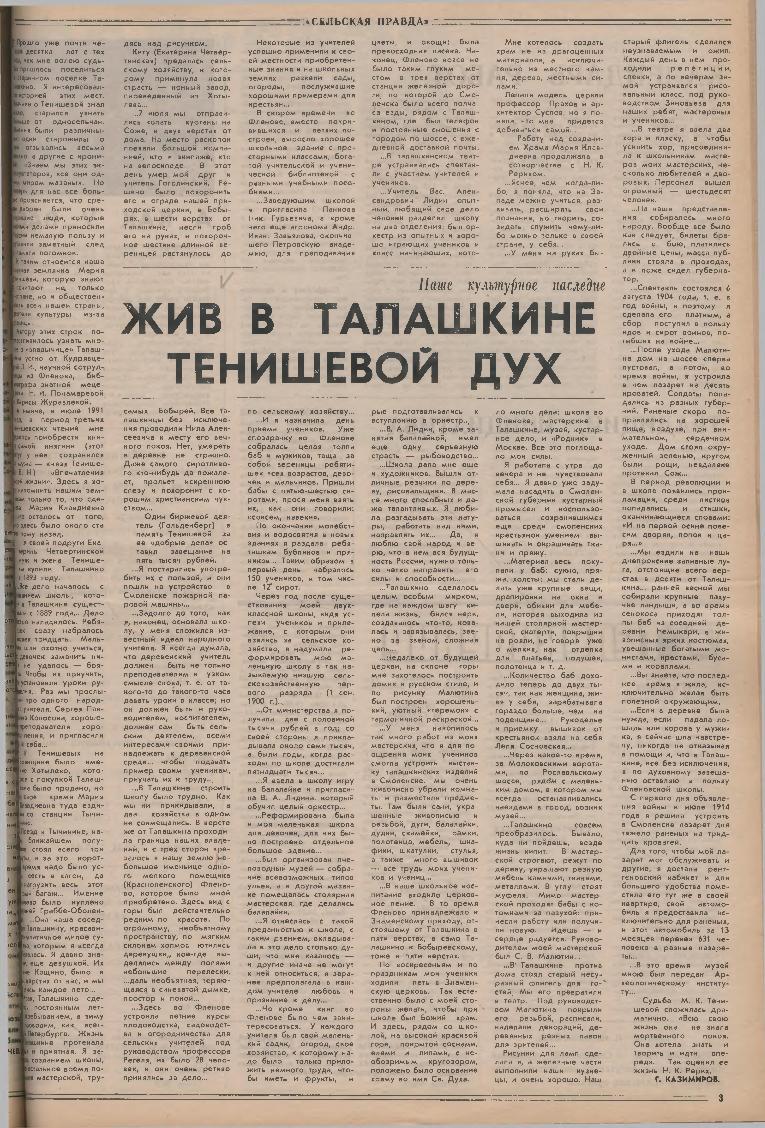 Казимиров, Г. Жив в Талашкине Тенишевой дух / Г. Казимиров // Сельская правда (Смоленский район), 1991. – 19 сентября — <URL:ftp://smolensklib.ru/bd/tenish/000005904.pdf>.