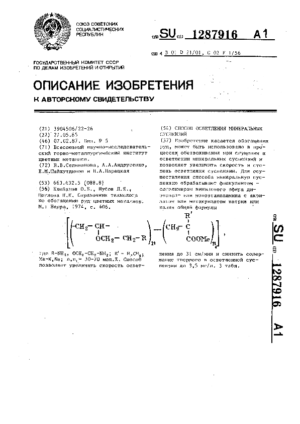 Способ осветления минеральных суспензий / Селиванова Н. В., Андрусенко А. А., Шайхутдинов Е. М., Парецкая Н. А.; заявитель: Всесоюзный научно-исследовательский горно-металлургический институт цветных металлов // Описания изобретений (ретрофонд) / Комитет по патентам и товарным знакам России. – М., 2003. – 1987, № 1. — (Патенты России). — Загл. с титул. экрана. — Поисковая система: MIMOSA GTI. — Систем. требования: Acrobat Reader. — Режим доступа: ftp://smolensklib.ru/bd/patent_ru/pt1287916.pdf. — <URL:ftp://smolensklib.ru/bd/patent_ru/pt1287916.pdf>.