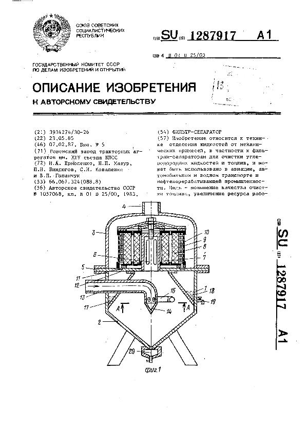 Фильтр-сепаратор / Ермоленко И. А., Мазур Н. П., Биндюгов П. Н. [и др.]; заявитель: Ровенский завод тракторных агрегатов им. XXV съезда КПСС // Описания изобретений (ретрофонд) / Комитет по патентам и товарным знакам России. – М., 2003. – 1987, № 1. — (Патенты России). — Загл. с титул. экрана. — Поисковая система: MIMOSA GTI. — Систем. требования: Acrobat Reader. — Режим доступа: ftp://smolensklib.ru/bd/patent_ru/pt1287917.pdf. — <URL:ftp://smolensklib.ru/bd/patent_ru/pt1287917.pdf>.