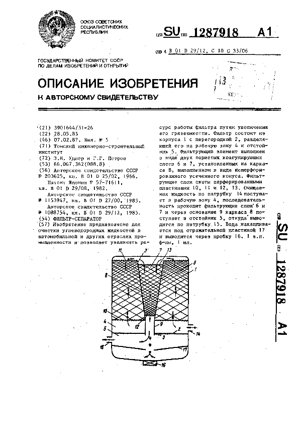 Фильтр-сепаратор / Удлер Э. И., Петров Г. Г.; заявитель: Томский инженерно-строительный институт // Описания изобретений (ретрофонд) / Комитет по патентам и товарным знакам России. – М., 2003. – 1987, № 1. — (Патенты России). — Загл. с титул. экрана. — Поисковая система: MIMOSA GTI. — Систем. требования: Acrobat Reader. — Режим доступа: ftp://smolensklib.ru/bd/patent_ru/pt1287918.pdf. — <URL:ftp://smolensklib.ru/bd/patent_ru/pt1287918.pdf>.
