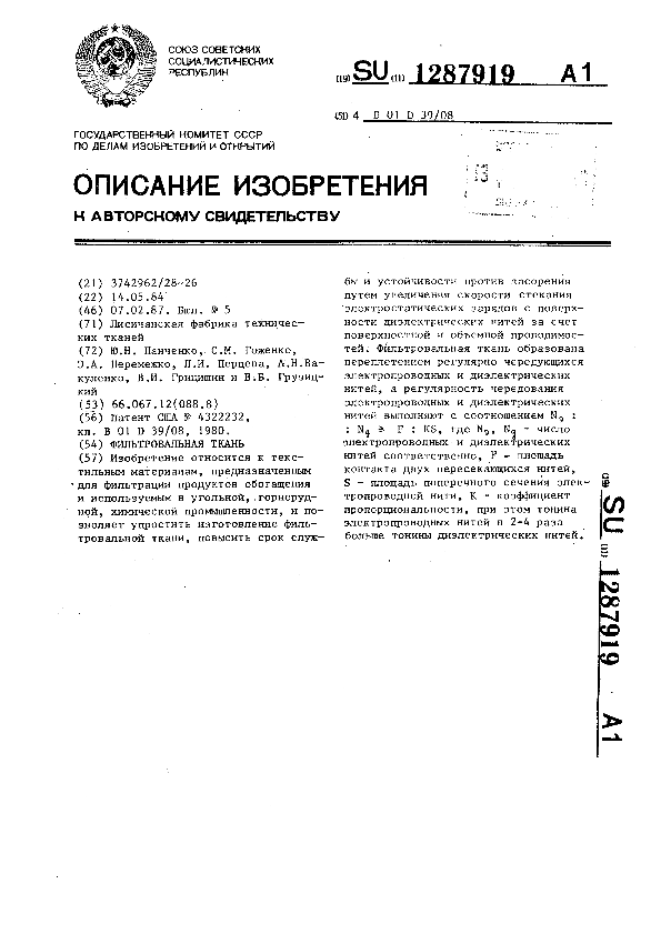 Фильтровальная ткань / Панченко Ю. Н., Гоженко С. М., Перемежко Э. А. [и др.]; заявитель: Лисичанская фабрика технических тканей // Описания изобретений (ретрофонд) / Комитет по патентам и товарным знакам России. – М., 2003. – 1987, № 1. — (Патенты России). — Загл. с титул. экрана. — Поисковая система: MIMOSA GTI. — Систем. требования: Acrobat Reader. — Режим доступа: ftp://smolensklib.ru/bd/patent_ru/pt1287919.pdf. — <URL:ftp://smolensklib.ru/bd/patent_ru/pt1287919.pdf>.