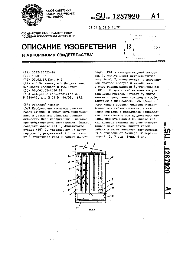 Рукавный фильтр / Баланник А. Д., Доброскокин А. И., Поляк-Соловьев В. А., Нечай Ю. К. // Описания изобретений (ретрофонд) / Комитет по патентам и товарным знакам России. – М., 2003. – 1987, № 1. — (Патенты России). — Загл. с титул. экрана. — Поисковая система: MIMOSA GTI. — Систем. требования: Acrobat Reader. — Режим доступа: ftp://smolensklib.ru/bd/patent_ru/pt1287920.pdf. — <URL:ftp://smolensklib.ru/bd/patent_ru/pt1287920.pdf>.