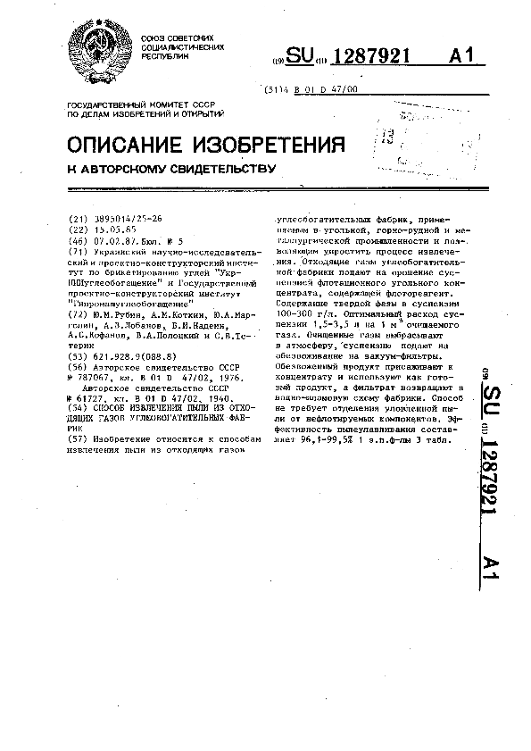 Способ извлечения пыли из отходящих газов углеобогатительных фабрик / Рубин Ю. М., Коткин А. М., Марголин Ю. А. [и др.]; заявитель: Украинский научно-исследовательский и проектно-конструкторский институт по брикетированию углей "УкрНИИуглеобогащение", Государственный проектно-конструкторский институт "Гипромашуглеобогащение" // Описания изобретений (ретрофонд) / Комитет по патентам и товарным знакам России. – М., 2003. – 1987, № 1. — (Патенты России). — Загл. с титул. экрана. — Поисковая система: MIMOSA GTI. — Систем. требования: Acrobat Reader. — Режим доступа: ftp://smolensklib.ru/bd/patent_ru/pt1287921.pdf. — <URL:ftp://smolensklib.ru/bd/patent_ru/pt1287921.pdf>.