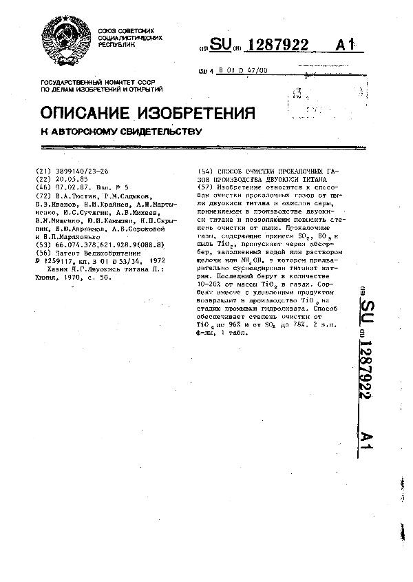 Способ очистки прокалочных газов производства двуокиси титана / Тюстин В. А., Садыков Р. М., Иванов В. В. [и др.] // Описания изобретений (ретрофонд) / Комитет по патентам и товарным знакам России. – М., 2003. – 1987, № 1. — (Патенты России). — Загл. с титул. экрана. — Поисковая система: MIMOSA GTI. — Систем. требования: Acrobat Reader. — Режим доступа: ftp://smolensklib.ru/bd/patent_ru/pt1287922.pdf. — <URL:ftp://smolensklib.ru/bd/patent_ru/pt1287922.pdf>.