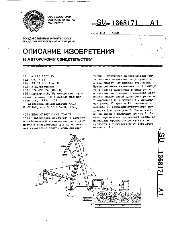 Шпонострогальный станок / Кравченко И. И. // Описания изобретений (ретрофонд) / Комитет по патентам и товарным знакам России. — М., 1994-____. — (Патенты России). – 1988, № 1. — Загл. с титул. экрана. — Поисковая система: ИПС MIMOSA GTI. — Систем. требования: Acrobat Reader. — Режим доступа: ftp://smolensklib.ru/bd/patent_ru/pt1368171.pdf. — <URL:ftp://smolensklib.ru/bd/patent_ru/pt1368171.pdf>.