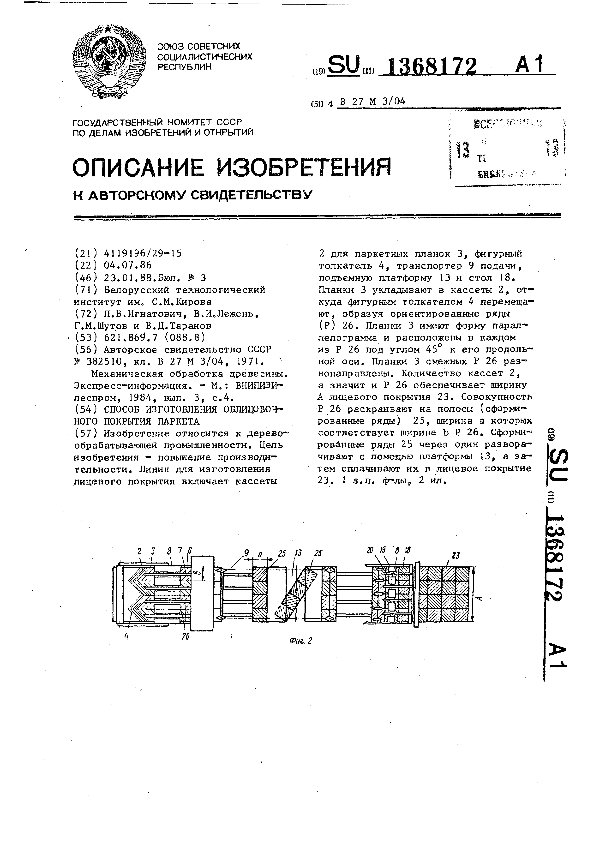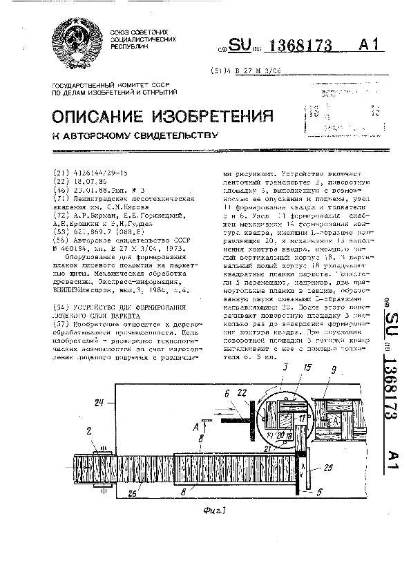 Устройство для формирования лицевого слоя паркета / Бирман А. Р., Горинецкий Е. Е., Ерошкин А. Н., Гудцев Р. И.; заявитель: Ленинградская лесотехническая, академия им. С. М. Кирова // Описания изобретений (ретрофонд) / Комитет по патентам и товарным знакам России. — М., 1994-____. — (Патенты России). – 1988, № 1. — Загл. с титул. экрана. — Поисковая система: ИПС MIMOSA GTI. — Систем. требования: Acrobat Reader. — Режим доступа: ftp://smolensklib.ru/bd/patent_ru/pt1368173.pdf. — <URL:ftp://smolensklib.ru/bd/patent_ru/pt1368173.pdf>.