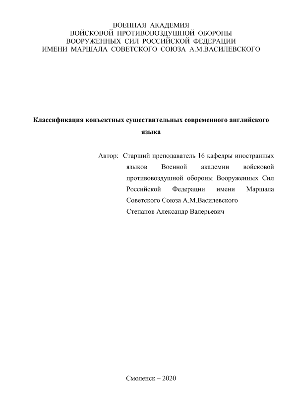 Степанов, Александр Валерьевич. Классификация пространственных конъектных существительных современного английского языка / Степанов А. В.; Военная академия войсковой противовоздушной обороны Вооруженных Сил Российской Федерации имени маршала Советского Союза А. М. Василевского. — Смоленск, 2020. — 23 с. 1 файл: 521 КБ: ил. — (Номинация: исследования в области гуманитарных наук). — Загл. с титул. экрана. — Электронная версия печ. публикации. — Систем. требования: Acrobat Reader. — Режим доступа: ftp://smolensklib.ru/bd/smol_uch/u00000982.pdf. — <URL:ftp://smolensklib.ru/bd/smol_uch/u00000982.pdf>.