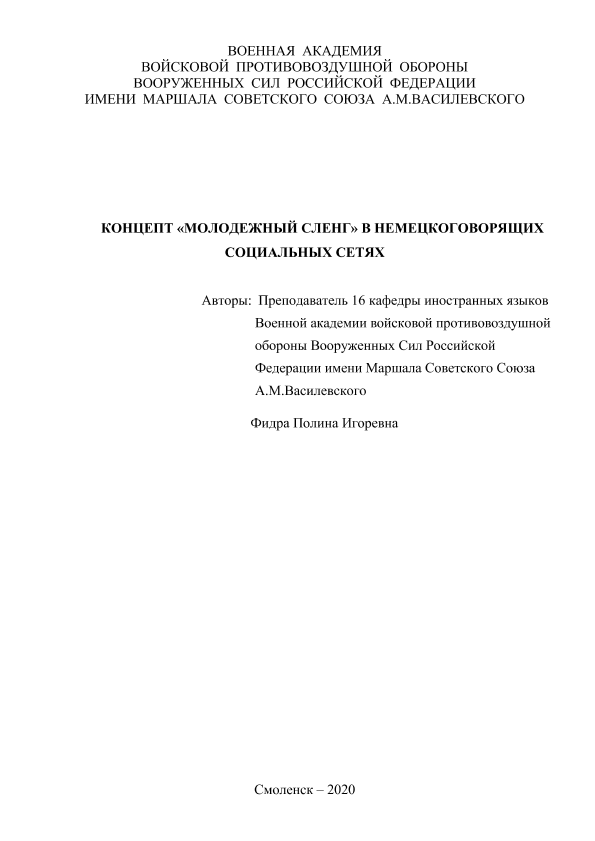 Фидра, Полина Игоревна. Концепт "молодежный сленг" в немецкоговорящих социальных сетях / Фидра П. И.; Военная академия войсковой противовоздушной обороны Вооруженных Сил Российской Федерации имени маршала Советского Союза А. М. Василевского. — Смоленск, 2020. — 25 с.; 1 файл: 520 КБ: табл. — (Номинация: исследования в области гуманитарных наук). — Загл. с титул. экрана. — Электронная версия печ. публикации. — Систем. требования: Acrobat Reader. — Режим доступа: ftp://smolensklib.ru/bd/smol_uch/u00000983.pdf. — <URL:ftp://smolensklib.ru/bd/smol_uch/u00000983.pdf>.