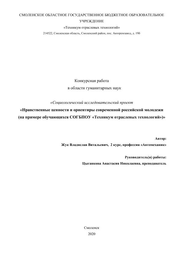 Жук, Владислав Витальевич. Социологический исследовательский проект "Нравственные ценности и ориентиры современной российской молодежи (на примере обучающихся СОГБПОУ "Техникум отраслевых технологий")": конкурсная работа / Жук В. В.; Смоленское областное государственное бюджетное образовательное учреждение "Техникум отраслевых технологий". — Смоленск, 2020. — 23 с.; 1 файл: 464 КБ: ил. — (Исследования в области гуманитарных наук). — Загл. с титул. экрана. — Электронная версия печ. публикации. — Систем. требования: Acrobat Reader. — Режим доступа: ftp://smolensklib.ru/bd/smol_uch/u00000985.pdf. — <URL:ftp://smolensklib.ru/bd/smol_uch/u00000985.pdf>.