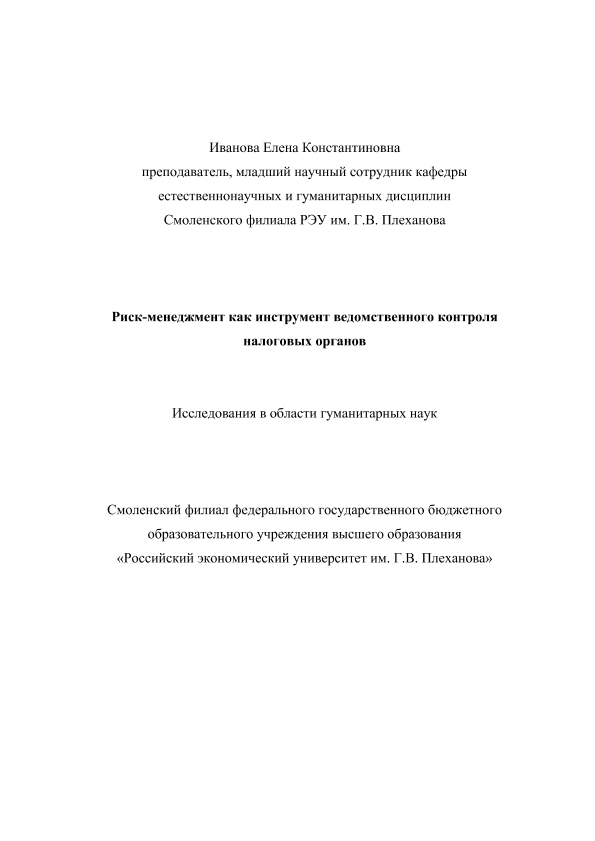 Иванова, Елена Константиновна. Риск-менеджмент как инструмент ведомственного контроля налоговых органов / Иванова Е. К.; Смол. фил. федерального гос. бюджетного образовательного учреждения высш. образования "Российский экономический ун-т им. Г. В. Плеханова". — [Смоленск, 2020. — 28 с.; 1 файл: 409 КБ: ил., табл. — (Исследования в области гуманитарных наук). — Загл. с титул. экрана. — Электронная версия печ. публикации. — Систем. требования: Acrobat Reader. — Режим доступа: ftp://smolensklib.ru/bd/smol_uch/u00000986.pdf. — <URL:ftp://smolensklib.ru/bd/smol_uch/u00000986.pdf>.