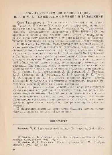 100 лет со времени приобретения В. Н. и М. К. Тенишевыми имения в Талашкине // Знай и люби свой край: библиографический указатель / Смол. обл. универс. б-ка [и др.; сост. : Г. В. Ковалёва, Е. И. Алексеенкова ; в подгот. участвовали : И. Н. Беляев и др.]. – Смоленск, 1993 С. 44-45 — <URL:ftp://smolensklib.ru/bd/tenish/000005437.pdf>.